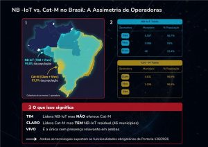 No Brasil, a TIM lidera o NB-IoT com cobertura em mais de 5.100 municípios (98,7% da população). A Vivo cobre 4.086 municípios. A Claro, por sua vez, concentrou seu foco em Cat-M, onde lidera com 4.631 municípios (96,6% da população), e tem presença significativamente menor em NB-IoT